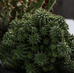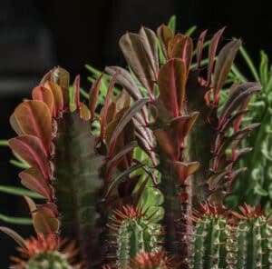 Les euphorbes font des petites inflorescences (cyathes) souvent discrètes. L’attrait majeur reste la forme et la texture des plantes au fil de l’année.
