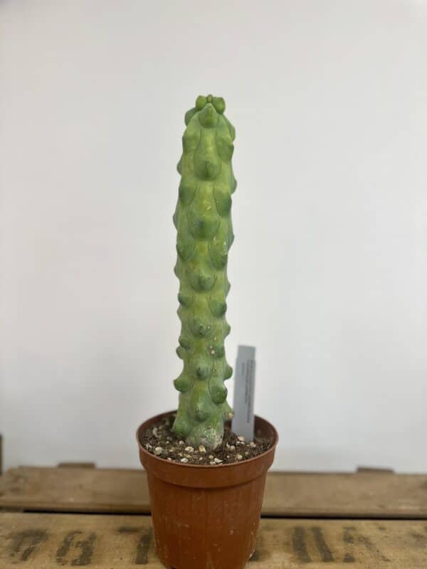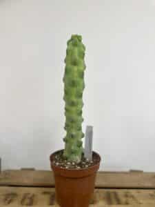 Cette forme de Myrtillocactus geometrizans est recherchée pour son aspect totalement atypique. Au lieu de pousser en colonne régulière, la plante développe des bosses, renflements et reliefs irréguliers qui lui donnent une allure presque minérale. Son coloris bleu-glauque renforce encore son côté rare et graphique. Chaque sujet est différent, ce qui en fait une vraie plante de collection.