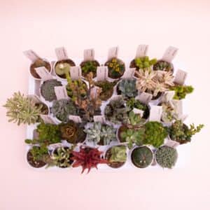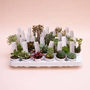 Chaque plateau rassemble de vraies miniatures : rosettes poudrées, formes zébrées, coussins compacts, petites colonnes… Le choix est aléatoire selon l’arrivage pour garantir de la diversité. Idéal pour composer une mini-jardinière ou démarrer une collection sans se tromper.